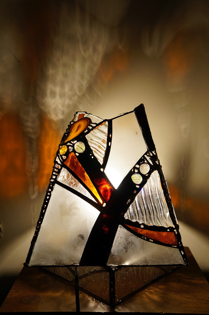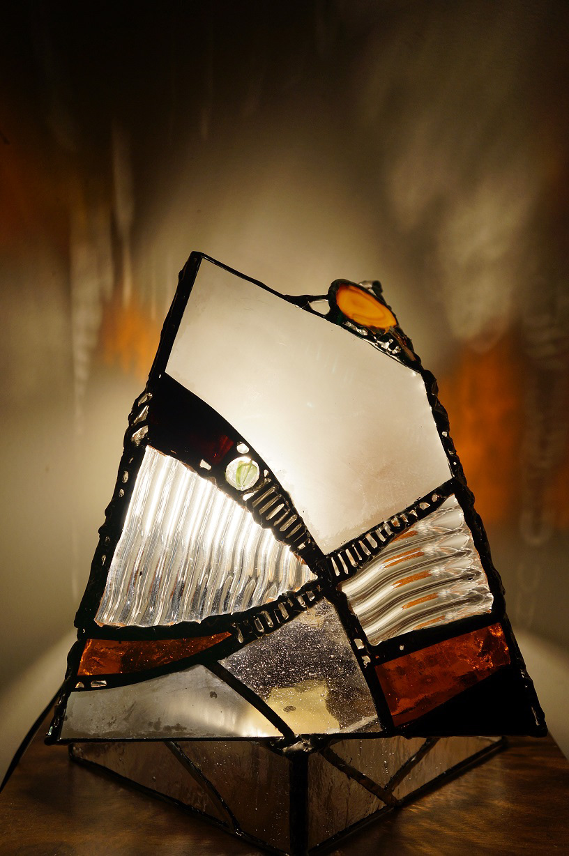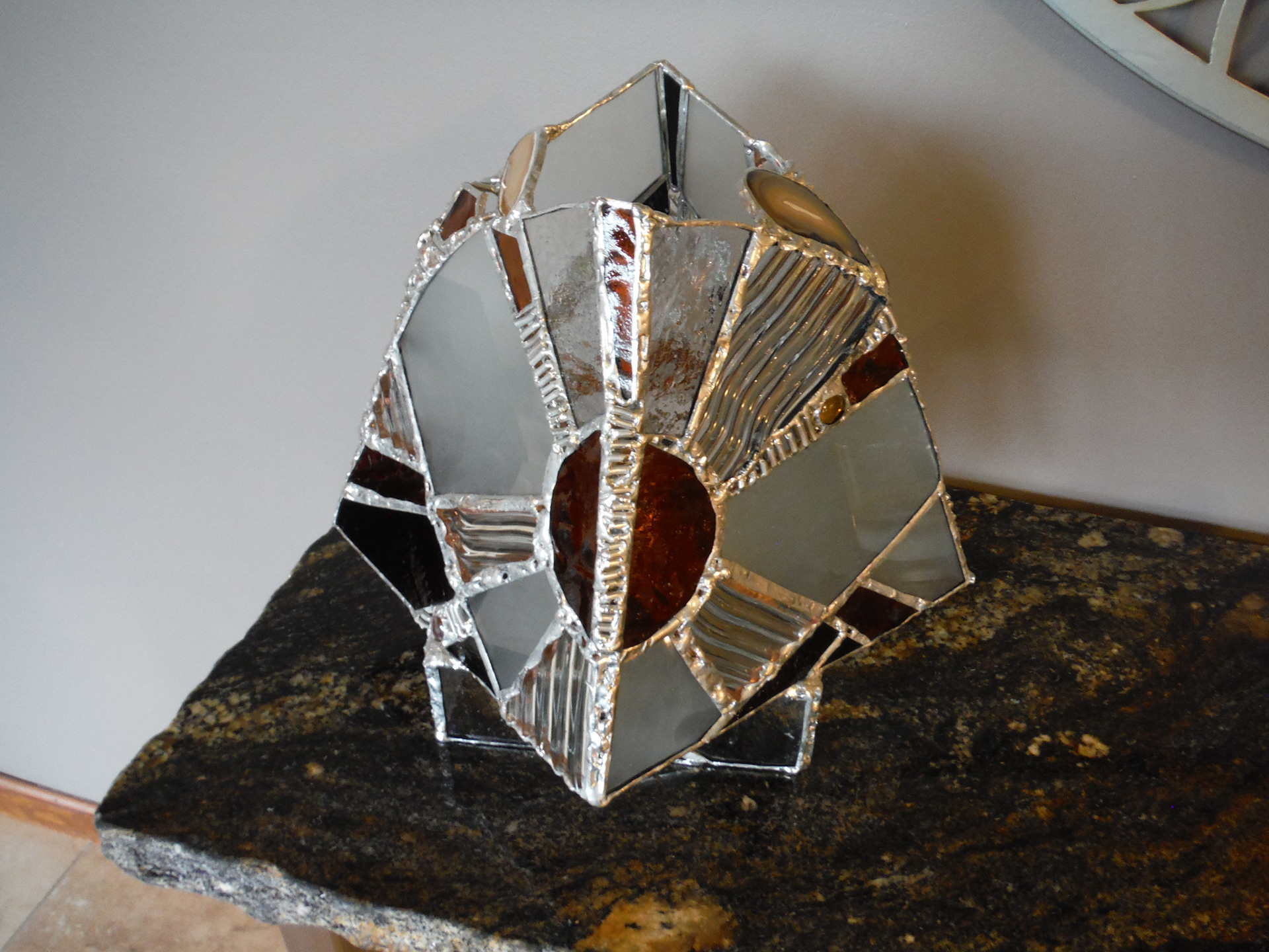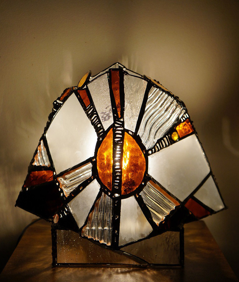 A piece commissioned and titled by the client, Celeste was created in keeping with the style and color palette of the room in which it is now displayed. The design incorporates abstract imagery of the sun and a tree in warm orange and brown tones, the rippled clear glass reminiscent of waves of light.